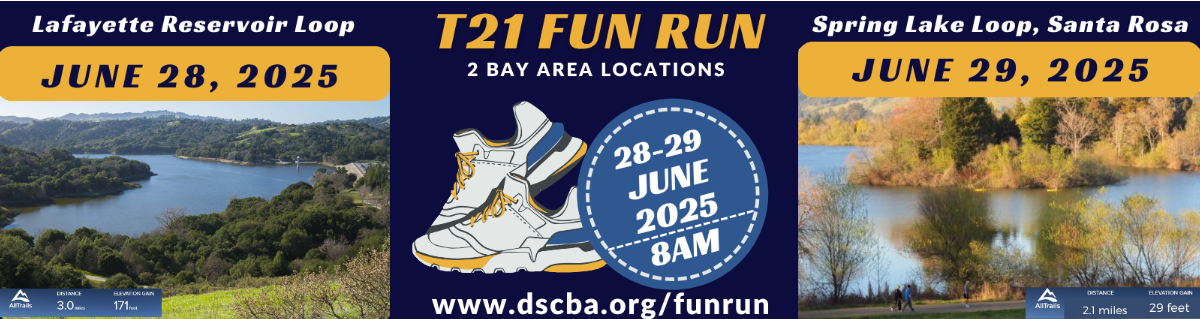 DSCBA's 3rd annual T21 Fun Run was on Saturday, 6/22/24.Simultaneously at two picturesque locations: In the East Bay at Lafayette Reservoir in Lafayette, and in the North Bay at Spring Lake Park in Santa Rosa. Over 150 registrants came out to run or walk along the beautiful park trails during this family-friendly outdoor activity. This fundraising event has not only become a tradition, but it also helps share ability awareness while opening conversations about the DSCBA’s mission with the community and curious park visitors. Together, we raised over $11,500 allowing the DSCBA to continue to provide: